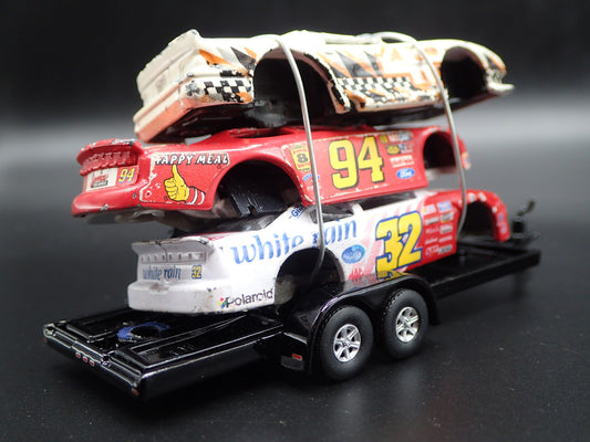 NASCAR +MUSTANG 3 CARS CRUSHED ON A FLATBED TRAILER 1:64 SCALE DIECAST MODEL CAR