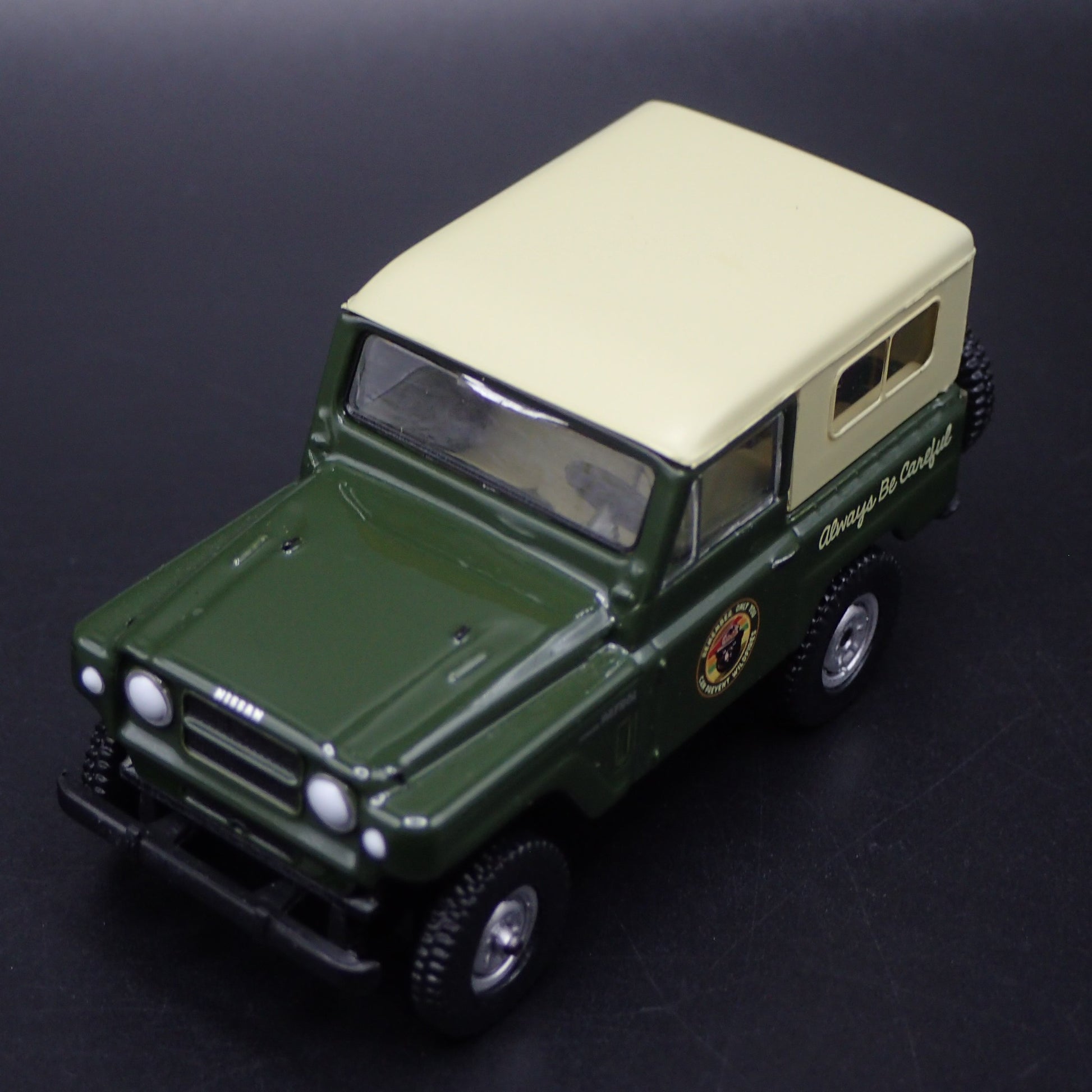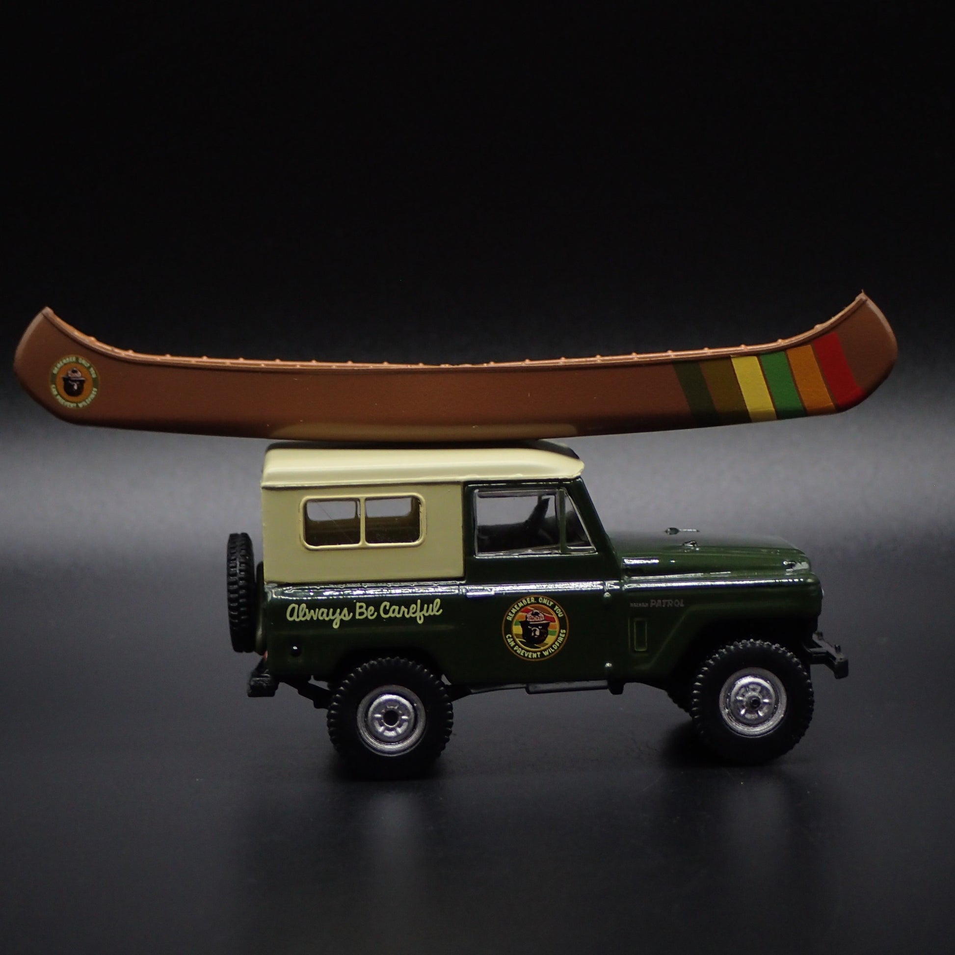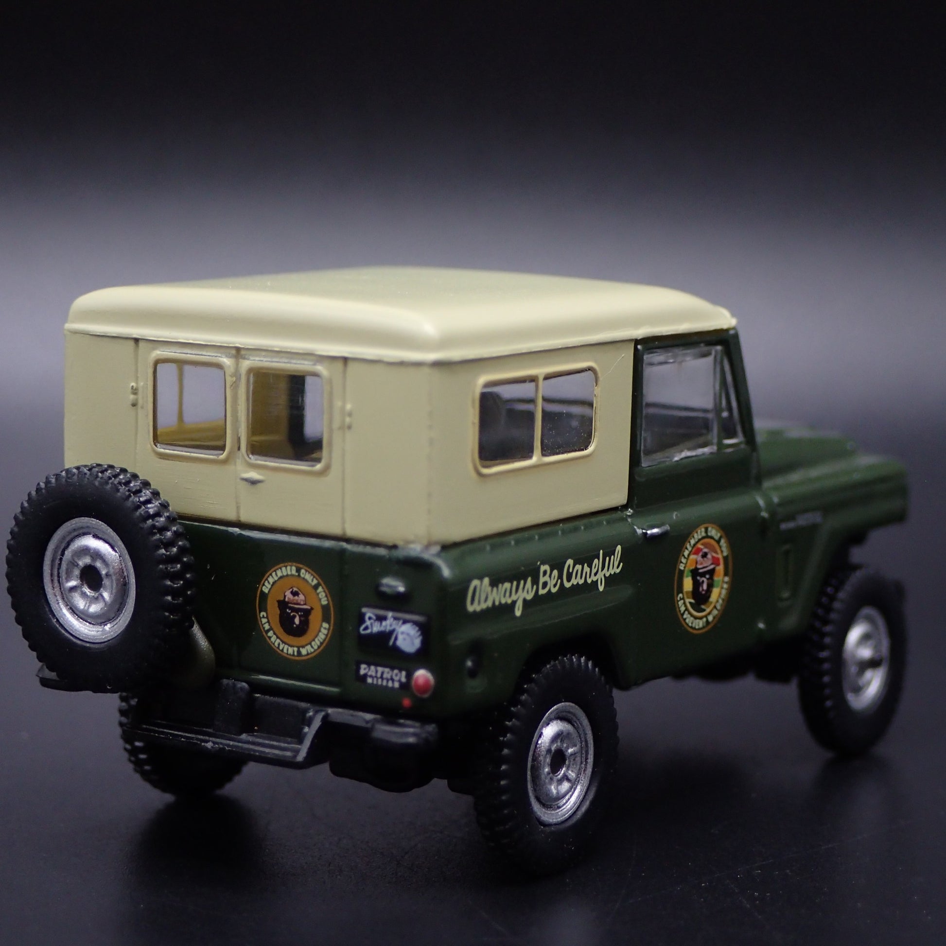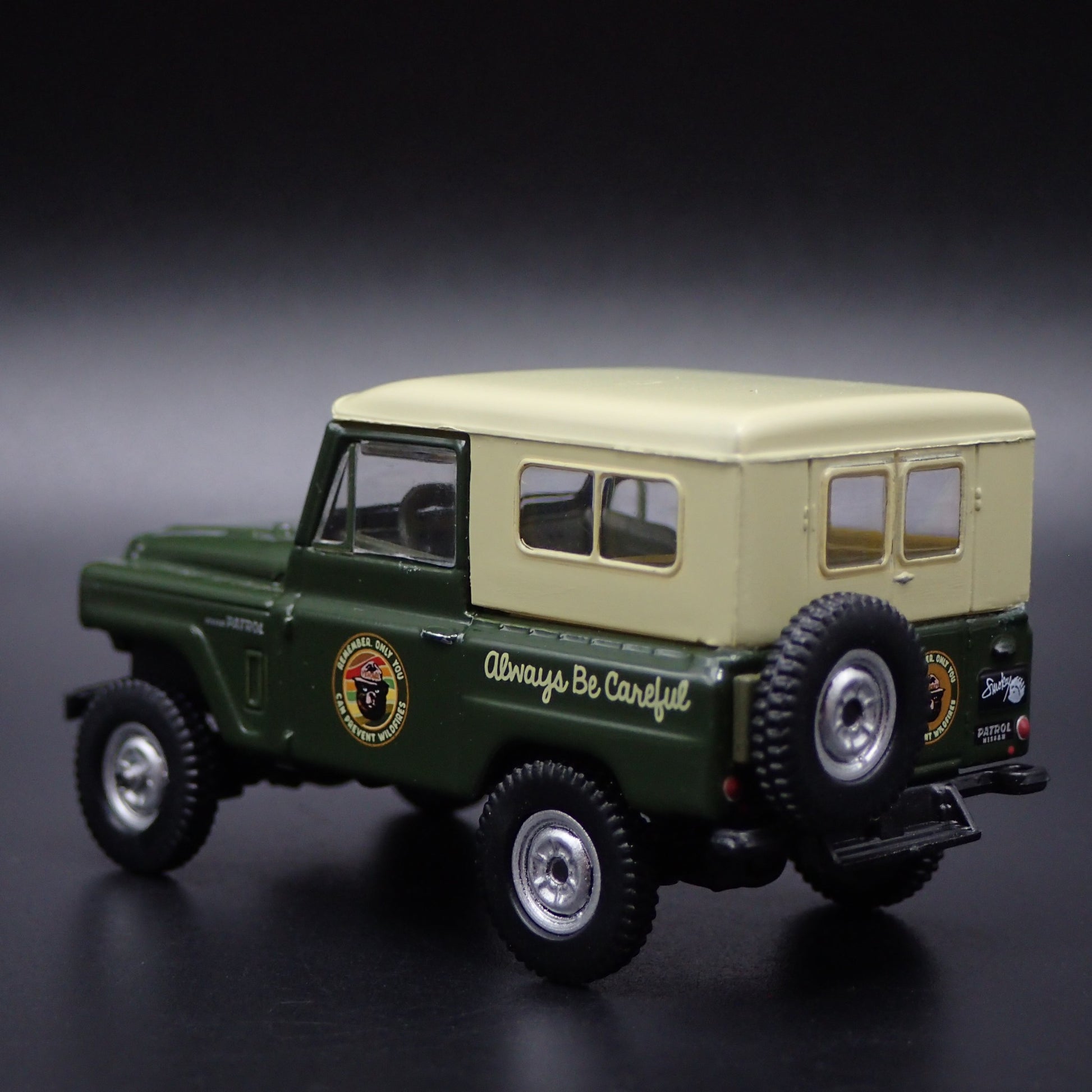 1960-1980 NISSAN PATROL W CANOE SMOKEY BEAR GREEN 1:64 SCALE DIECAST MODEL CAR from Burning Rubber Toy Company